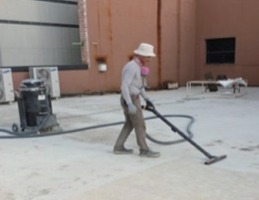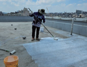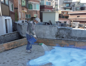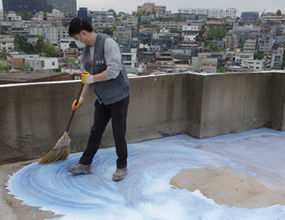 도포한 하도를 퍼트리듯 긴 빗자루로 1차 시공